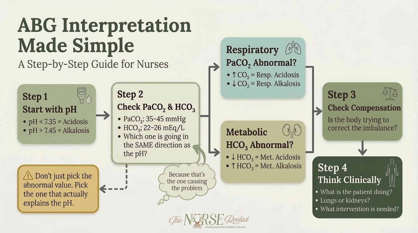 Whether you’re a nursing student, new grad, or transitioning into a higher-acuity setting, this guide will help you simplify acid-base interpretation and start thinking through it with confidence.